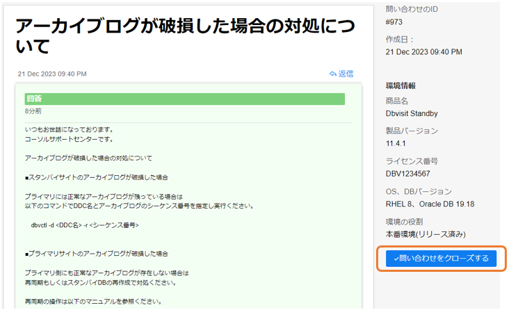 お問い合わせの問題が解決した場合は、「返信」からクローズの旨をご連絡いただくか、画面右側の[問い合わせをクローズする]をクリックください。