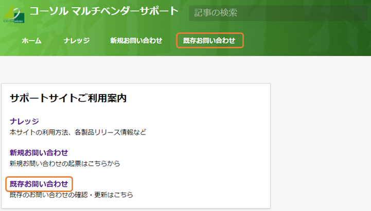 1. 以下のどちらかから「既存お問い合わせの一覧」画面を開きます。